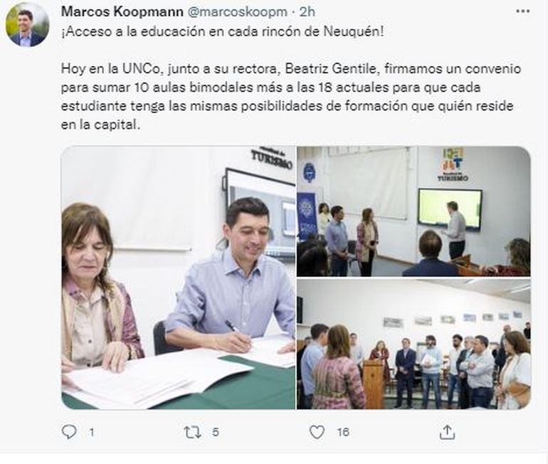 El vicegobernador Marcos Koopmann firmó este miércoles por la mañana un acta acuerdo con la rectora de la Universidad Nacional del Comahue, Beatriz Gentile, para el aporte por parte de la Legislatura de más de $11.300.000 que serán utilizados en la puesta en marcha de 10 aulas bimodales afectadas a distintas unidades académicas que la casa de estudios tiene en el interior neuquino y que se suman a las 18 incorporadas por Nación durante este año.