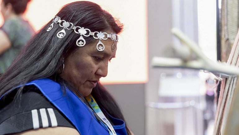 La artesana Georgina Calfuqueo, proveniente de la comunidad mapuche de Linares, deslumbró al público en la Feria Internacional de Turismo (FIT), realizada en el Predio de La Rural de Buenos Aires.