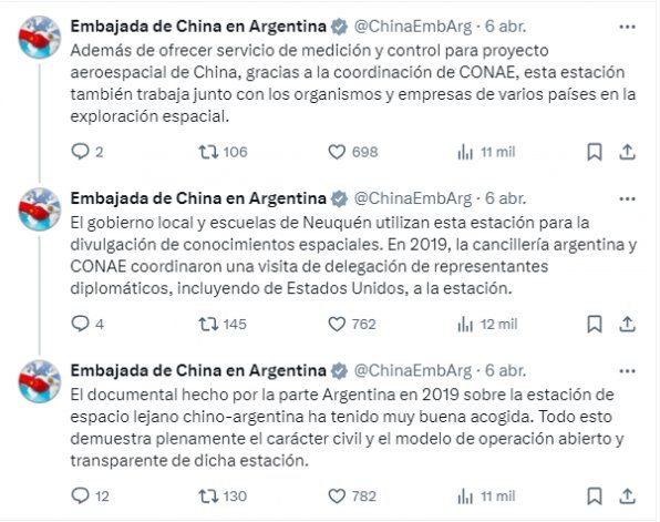 “El 8 de abril, Embajador Wang Wei mantuvo una positiva reunión de trabajo con la Canciller, Diana Mondino. Ambos llegaron al acuerdo de desmentir la especulación de que la Estación de Espacio Lejano es supuesta base militar”, escribieron desde la cuenta oficial de la Embajada China.