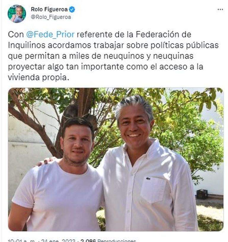 En los últimos días, el ex emepenista y candidato a gobernador por Comunidad, Rolando Figueroa, anunció que había sellado un acuerdo con Federico Prior, referente de la Federación Nacional de Inquilinos en Neuquén, quien planteó que en toda la provincia hay 170 mil inquilinos que destinan la mayor parte de sus ingresos a costear el valor mensual del alquiler.