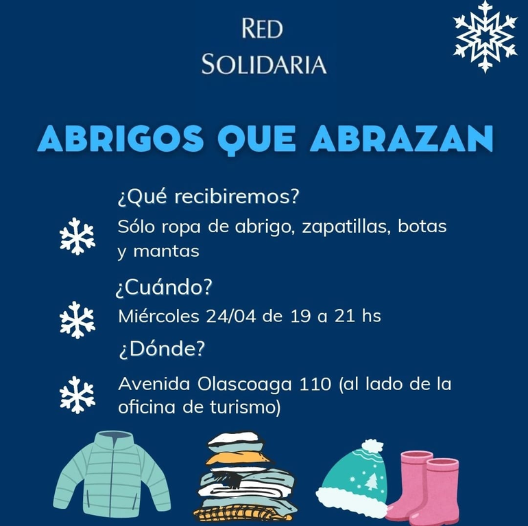 La campaña tendrá su colecta este miércoles y todo será bienvenido: alimentos, ropa, mantas. El lugar donde se juntará todo es al lado de la Oficina de Turismo, en Avenida Olascoaga y las vías, desde las 19 a las 21.