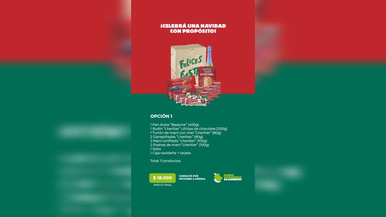 La canasta navideña consta de once productos dulces, incluida una sidra, de primera marca. Cuesta 18 mil pesos. Para ser más precisos, se compone de un pan dulce, un budín con chips de chocolate, un turrón de maní con miel, dos garrapiñadas, dos maní confitado, dos postres de maní, una sidra, la caja y la tarjeta.