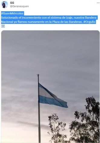 "Buen miércoles. Solucionado el inconveniente con el sistema de izaje, nuestra Bandera Nacional ya flamea nuevamente en la Plaza de las Banderas", comunicó Gerardo Gutiérrez, a cargo de la Unidad de Relaciones Institucionales de la Municipalidad, a través de su cuenta de Twitter.