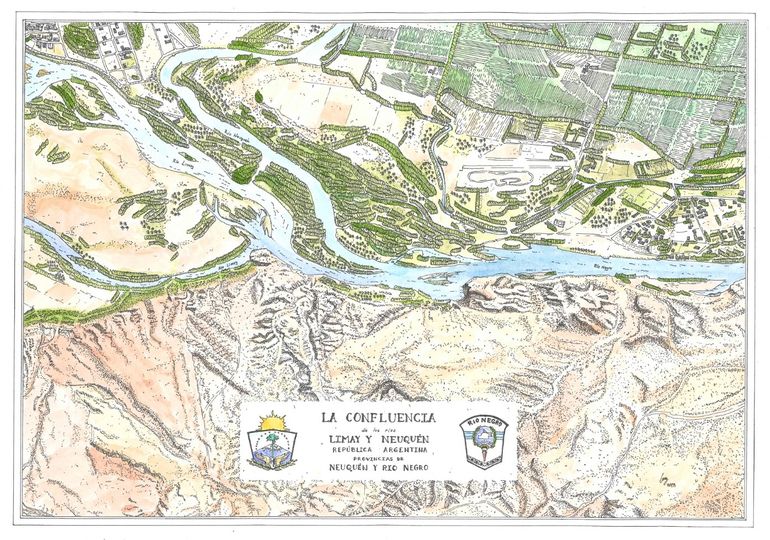 En diálogo con este medio, el dibujante contó que llegó a representar el emblema del Alto Valle a partir de un pedido, sin haber pisado nunca suelo neuquino ni rionegrino. "Yo trabajo con mapas satelitales, de los cuales tomo cierta información para luego representarla de alguna u otra manera. En ese caso trasladé esa información a una técnica isométrica que tiene ciertas escalas y medidas para desarrollarla con una técnica propia a mano alzada, más libre. Por eso el mapa tiene esa forma y también por eso siempre aclaro que hago ilustración cartográfica y no cartografía. Todos los mapas que he hecho son a mano, más allá de que luego los digitalizo para hacer una reproducción seriada", remarcó.
