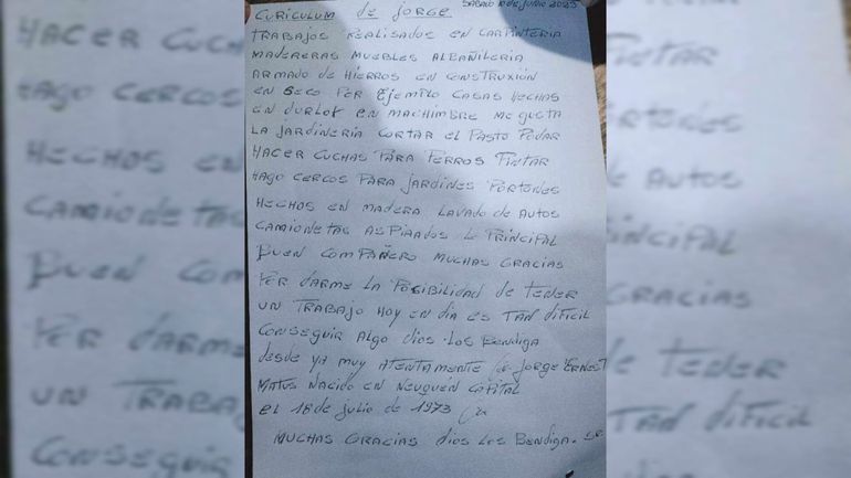 En su hoja de vida relató todo lo que sabe hacer. Desde trabajos en carpintería, albañilería, armado de hierros para construcciones en seco, machimbre y durlok, hasta cuchas para perros, ceros para jardines y lavado de autos. "Muchas gracias por darme la posibilidad de un trabajo", expresaba en su CV, como si nunca estuviese de más agradecer los dos o tres minutos de atención, el sólo hecho de leerlo y considerar su pedido.