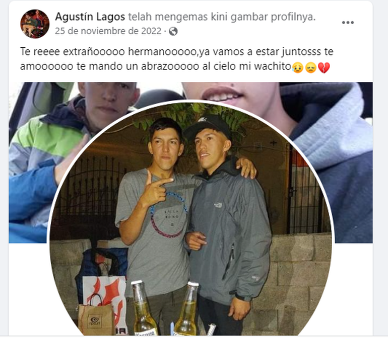 "Te re extraño hermano, ya vamos a estar juntos. Un abrazo al cielo mi wachito", posteó hace poco Agustín en su muro de Facebook. Entonces, nunca se hubiese imaginado que lo iban a matar a tiros por una moto que había ofrecido para la venta, en el barrio Villa Ceferino. Ocurrió el sábado pasado, en horas de la tarde, y su muerte causó gran conmoción y dolor en su familia, amigos y compañeros de trabajo.