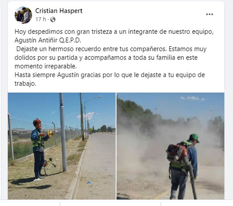 "Un excelente compañero de trabajo. Muy joven, con muchas ganas de trabajar y hacer amigos. Todo el personal de la subsecretaria -de Limpieza Urbana-está muy golpeado. Fue una persona que se hizo querer muy rápido", expresó Cristian Haspert, al frente del área municipal.