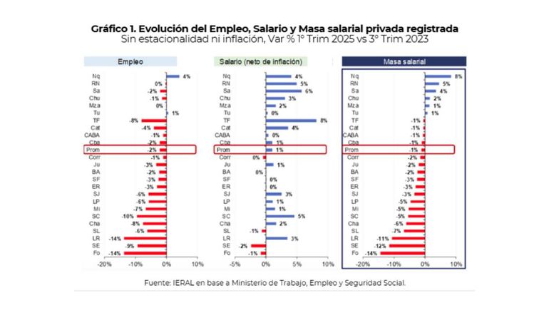 Por otro lado, al comparar el salario real, el promedio nacional muestra un crecimiento del 1%. Neuquén está por encima de la media, con una variación positiva del 4%, el mismo número que se registró en Catamarca. Sin embargo, las provincias con mejores incrementos salariales entre diciembre de 2023 y el primer trimestre de 2025 fueron Tierra del Fuego (8%), Salta (6%) y Río Negro (4%).