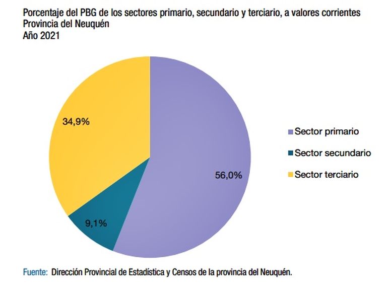 A nivel estructural, Neuquén continúa teniendo una economía eminentemente primarizada: el sector primario representó el 56% del PBG 2021 a valores corrientes. En comparación, para el mismo período a nivel nacional, este sector representó el 13% del PIB según datos de INDEC.