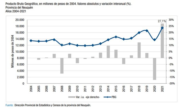 La economía neuquina alcanzó su mayor tamaño considerando los datos publicados desde 2004 después de la pandemia de coronavirus. En 2020 se registró la mayor caída interanual del PBG del periodo, pero un año después el crecimiento fue incomparablemente superior a lo conocido.