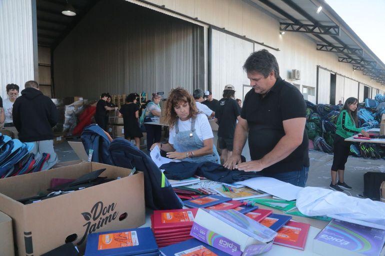 El intendente de Neuquén, Mariano Gaido y la secretaria de Jefatura de Gabinete, María Pasqualini, estuvieron este viernes por la mañana en los galpones de la Muni del Oeste, donde mostraron cómo se están armando los kits escolares que se entregan en la ciudad por quinto año consecutivo.