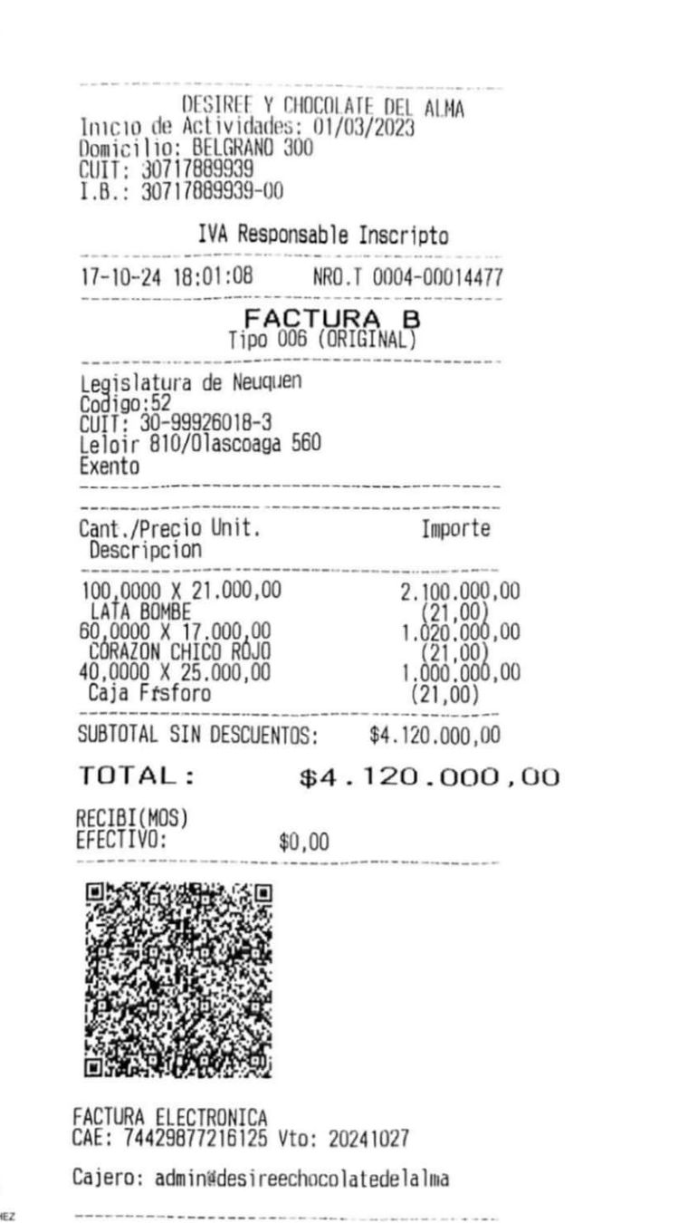 Lo que apareció en esta oportunidad, y que tuvo acceso LMNeuquén, es una factura de $4.120.000 (cuatro millones ciento veinte mil pesos) con fecha del 17 de octubre de este año por la compra de bombones al local Desiree, Chocolates del Alma, de la calle Belgrano 300, en Plottier.