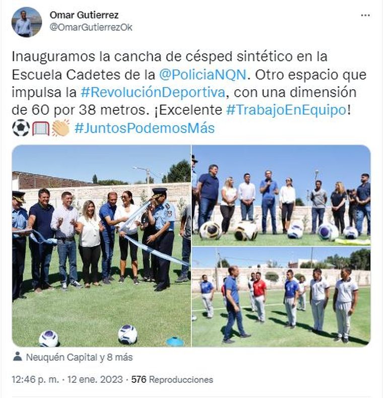 El gobernador Omar Gutiérrez y el intendente Mariano Gaido inauguraron este jueves una nueva cancha de césped sintético en la Escuela de Cadetes “Comisario Inspector Adalberto Staub” de la Policía de la provincia, ubicada en esta ciudad. Fue construida por la Unidad Provincial de Enlace y Ejecución de Proyectos con Financiamiento Externo (Upefe) y el ministerio de Deportes, a solicitud de la Secretaría de Seguridad. Demandó una inversión de 26.570.000 pesos.
