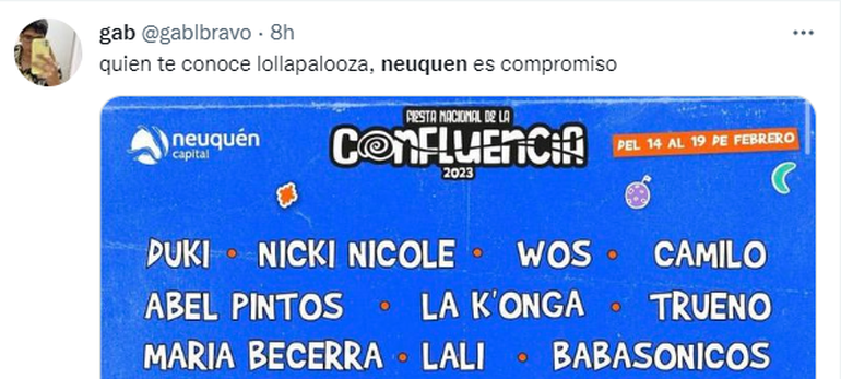 Cientos de usuarios llenaron las redes sociales de mensajes que festejan la grilla completa de artistas nacionales e internacionales confirmados en el escenario mayor para la Fiesta Nacional de la Confluencia 2023, que se realizará del 14 al 19 de febrero. La mayoría, por no decir casi todos, apoyan el evento cultural más importante de Neuquén y los que no son locales ya están buscando la manera de llegar y ser parte.