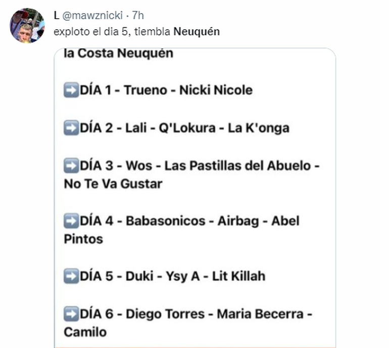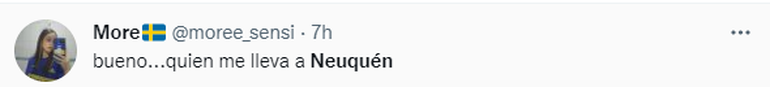 "Acepto algún canje de viaje a Neuquén para febrero", tiró con humor un usuario. Enseguida, otros le contestaron: "Vengan, yo los hospedo". Y no faltó quien lanzó la búsqueda de amigos y amigas de Neuquén. La charla siguió y fueron muchos más. "Decime que es joda". "Esto es mejor que el Lollapalooza". "Encima gratuito. Hermoso todo". "Me voy a vivir a Neuquén, muchachos". Hubo gente que arrobó a conocidos para la fiesta como "regalo de cumpleaños".