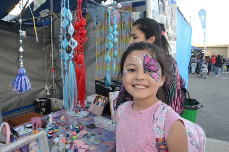 Estampa hermosas mariposas y otros dibujos en las caras de los más pequeños que quedan más que brillosas de alegría y emoción. Una de las que se puso más que contenta este viernes fue Amaia, una pequeña de 8 años quien ya había visitado el puesto de "Arte Azul Celeste" el miércoles pasado y volvió especialmente para no quedarse con las ganas de salir maquillada.