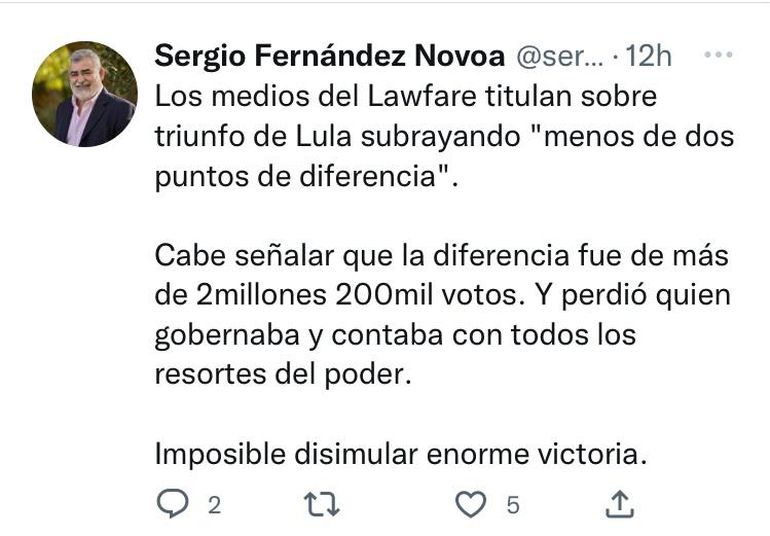 “Los medios del Lawfare titulan sobre el triunfo de Lula subrayando ‘menos de dos puntos de diferencia. Cabe señalar que la diferencia fue más de 2 millones 200 mil votos. Y perdió quien gobernó y contaba con todos los resortes del poder”, escribió el diputado en su cuenta de Twitter.