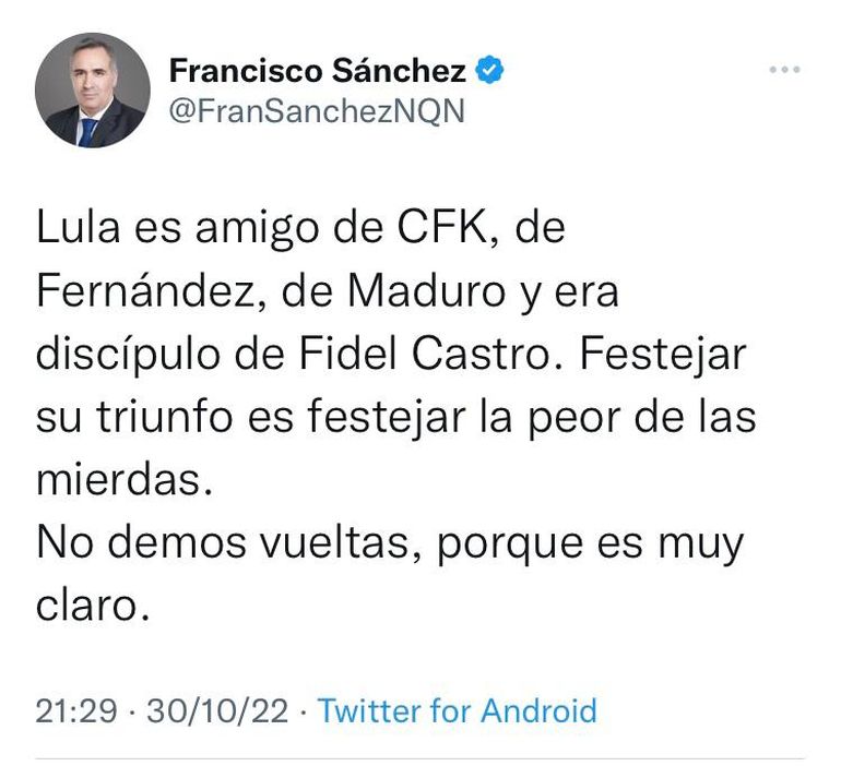 “Lula es amigo de CFK, de Fernández, de Maduro y era amigo de Fidel Castro. Festejar su triunfo es festejar la peor de las mierdas. No demos vueltas porque es muy claro”, sentenció el legislador nacional por Neuquén, quien ya fue criticado por sus pares por “incitar al odio”, luego del intento de magnicidio contra Cristina Kirchner.