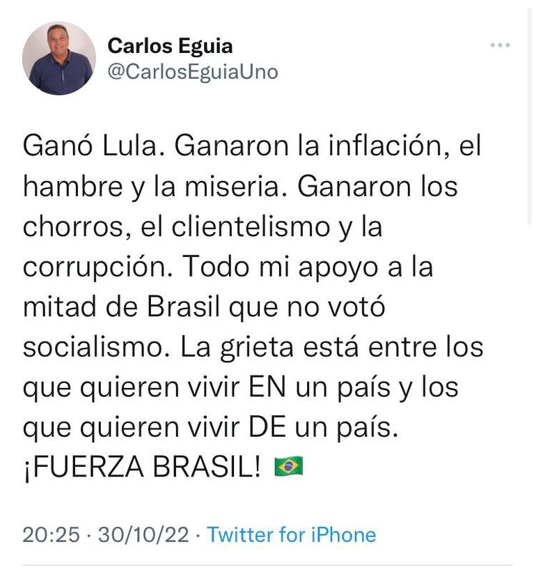 “Lula ganó, ganaron la inflación, el hambre y la miseria. Ganaron los chorros, el clientelismo y la corrupción”, subrayó Eguía.
