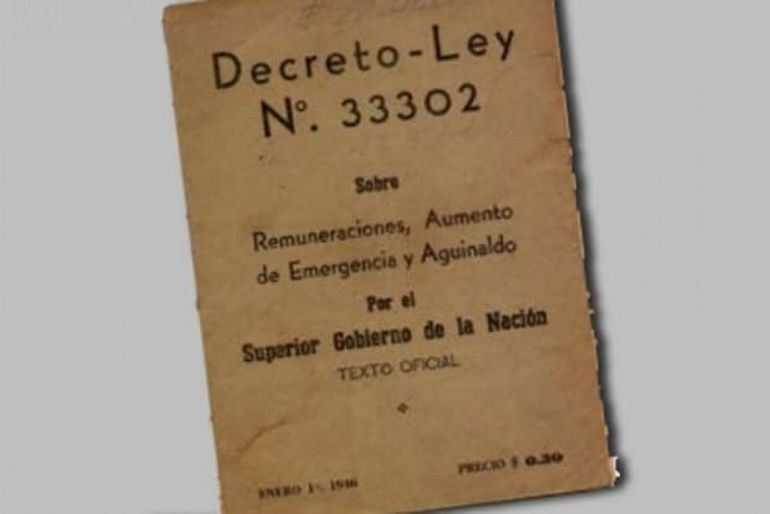 El 20 de diciembre de 1945, por decreto N° 33.302 del Presidente Farrel, por iniciativa del Coronel Juan Domingo Perón se instituye, por primera vez, el sueldo anual complementario o aguinaldo. El decreto crea el «Instituto Nacional de Remuneraciones», otorga un aumento salarial y lo que es muy importante extiende a todos los trabajadores el beneficio de vacaciones pagas, las licencias por enfermedad hasta seis meses, la indemnización por despido y muerte. Todos derechos laborales que hoy son casi naturales en la Argentina, pero que en el resto del mundo tardaron décadas en imponerse.