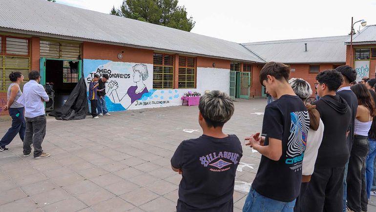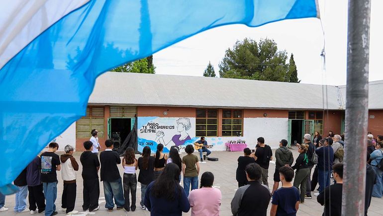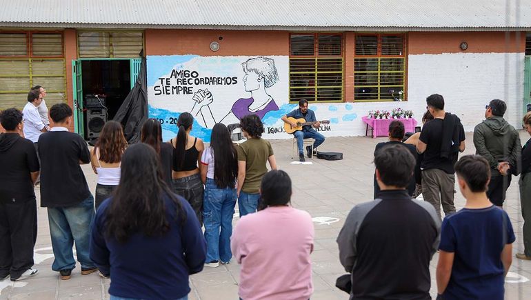 El patio de la escuela ya estaba iluminado con un mural hermoso que diseñaron entre todos. “Amigo, te recordaremos siempre”, dice bajo una imagen de Juan dándole la mano a alguien que no se ve pero que representa un todos. Ernesto llegó a las corridas porque coincidía con el horario en que salía de la escuela de donde trabaja, pero en el momento justo. La canción que compuso el abuelo Emilio comenzó a sonar entre los compañeros, sus madres y padres, docentes y la familia de Juan.