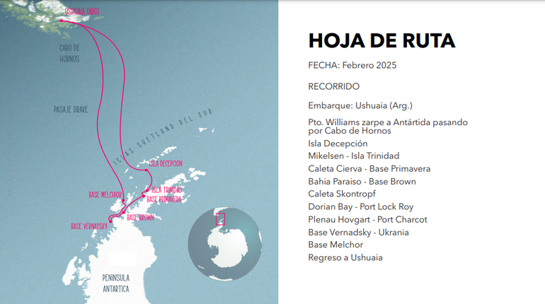 La hoja de ruta que van a recorrer iniciará en Ushuaia, Argentina, el primero de febrero. "Pasamos el pasaje Drake -calculamos que nos llevará una semana- y después vamos a estar navegando en velero unos 15 días todo lo que es la Península Antártica, una zona denominada dominio uno, que es la que se busca proteger. Nuestros nados van a ser en dupla o individuales... depende de las condiciones del clima que tengamos", contó Cristina.