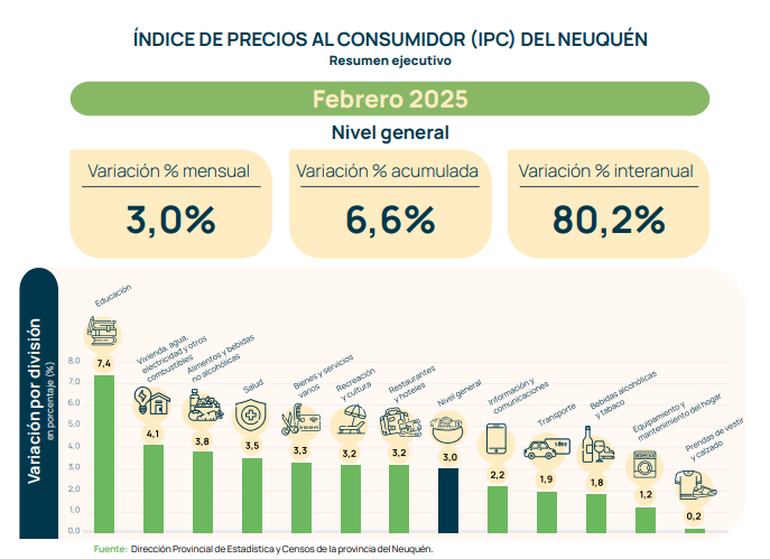 La inflación en Neuquén fue del 3% en el mes de febrero, un número levemente inferior al mes anterior que había sido del 3,5 por ciento en la provincia. La acumulada de los dos primeros meses del 2025 fue del 6,6 por ciento.