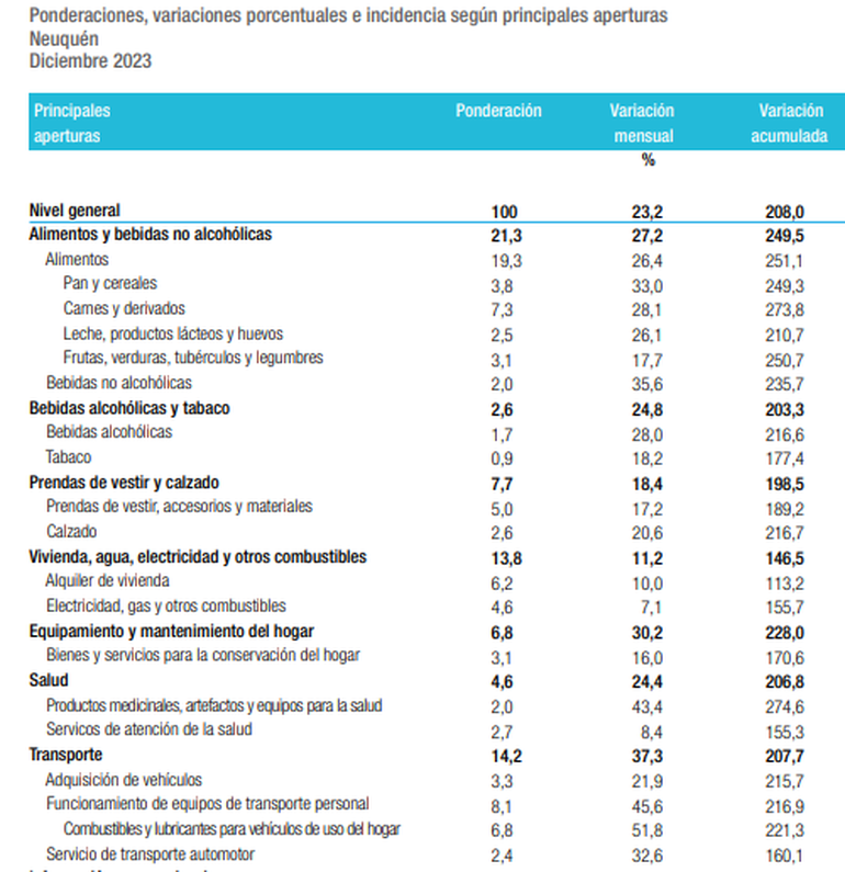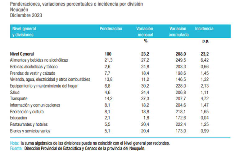 El índice de precios al consumidor (IPC) del mes de diciembre fue del 23,2 por ciento en el conglomerado Neuquén, según lo que informó la Dirección de Estadísticas y Censos de la Provincia.