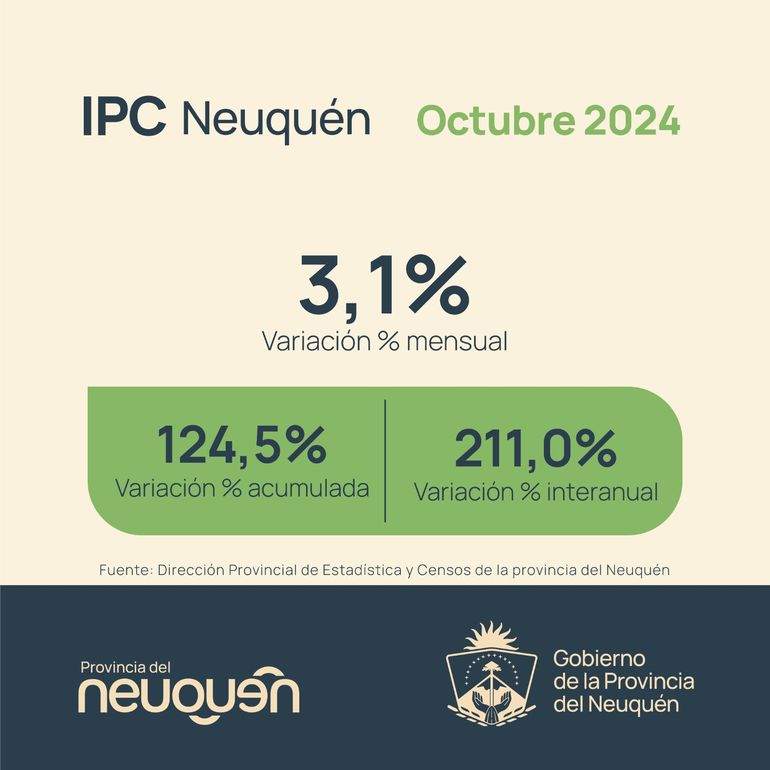 El Índice de Precios al Consumidor (IPC) en Neuquén fue del 3,1% durante el mes de octubre, registrando una baja con respecto al mes anterior, que había sido del 3,9 por ciento.