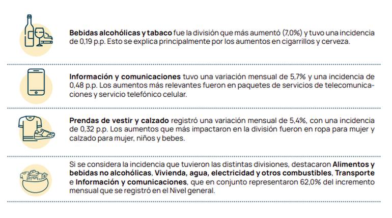 La división de mayor variación mensual fue Bebidas alcohólicas y tabaco (7,0%), con una variación interanual del 237,3%. Por su parte, la división que mayor contribución tuvo en la variación del Nivel general fue Alimentos y bebidas no alcohólicas.