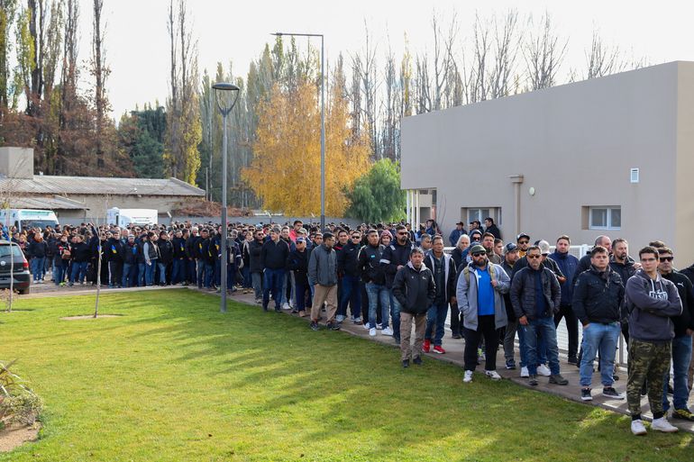 Trabajadores con pasamontañas, gafas negras, camperas azules, algunos de servicio y otros de franco, desfilaron de a uno frente al líder. En las filas todos eran uno. Se notaba quizás por la ropa quienes ocupaban cargos jerárquicos y quienes venían de la boca del pozo. Pero esas tiras y chapas no importaron en ese momento.