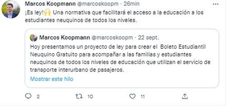 “La educación es la herramienta más poderosa que tenemos para transformar la realidad y construir un futuro mejor para todos. Por eso, es una gran noticia para todas las familias neuquinas que el Boleto Estudiantil Gratuito a partir de esta ley pase a ser una política de Estado” sostuvo Koopmann y destacó la importancia de esta “decisión política que ha sido llevada adelante por el Gobierno de la provincia y que hoy recibió el respaldo mayoritario de la Legislatura, con el objetivo de facilitar el acceso a la educación de todos los chicos y chicas de nuestra provincia”.