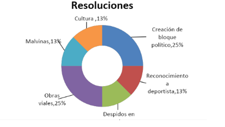 Al realizarse un corte sobre las temáticas abordadas a partir de iniciativas de declaración (108), el cuerpo deliberativo se expresó sobre propuestas culturales (37%), deporte (13%), aniversarios (9%), pronunciamientos políticos (8%), actividades vinculadas a la educación (7%) y de salud (6%), entre otros temas aprobados.