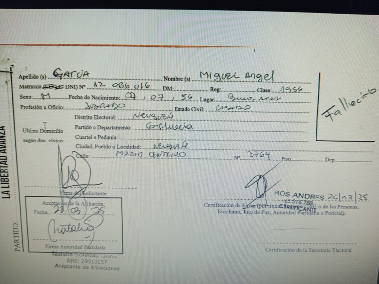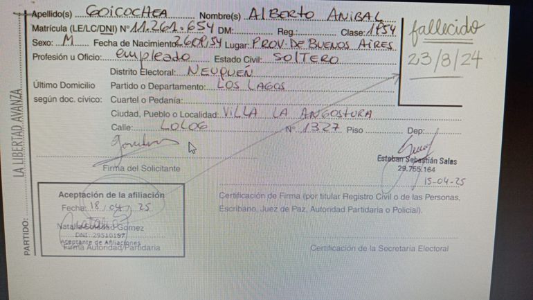 Se trata de Alberto Aníbal Goicochea, DNI Nº 11.261.654 quien registra “una baja del subregistro Electoral del Distrito de Neuquén por el fallecimiento acaecido con fecha 23 de agosto de 2024” y cuya ficha de afiliación había sido presentada en su carácter de autoridad certificante del partido LLA por Esteban Sebastián Salas, el 15 de abril de este año.