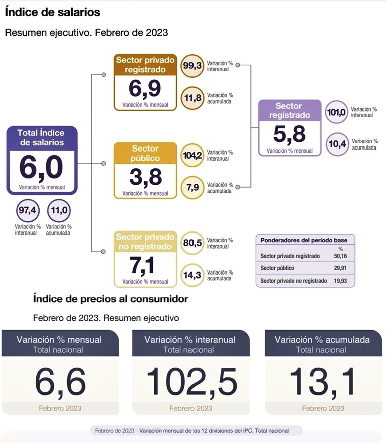 El INDEC informó este viernes el índice salarial de febrero. Corrobora la senda de la destrucción del poder adquisitivo. Creció 6% en un mes, 0,6 punto por debajo de la inflación, mientras que en el acumulado del bimestre inicial del año electoral el salario perdió por dos puntos con la inflación. En un año, el índice salarial se incrementó 97%, contra el 102,5% de inflación anual, según el INDEC.