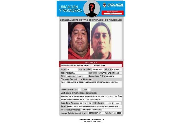 La búsqueda de Marcelo Alejandro Mendoza continúa vigente en las redes sociales de la Policía de Neuquén. Allí se muestran fotografías para facilitar su búsqueda y se lo describe como un hombre de contextura física robusta y una altura de 1.70 metros. Asimismo se detalla que tiene tez trigueña, cabello semi largo, lacio y color negro y ojos marrones claros.