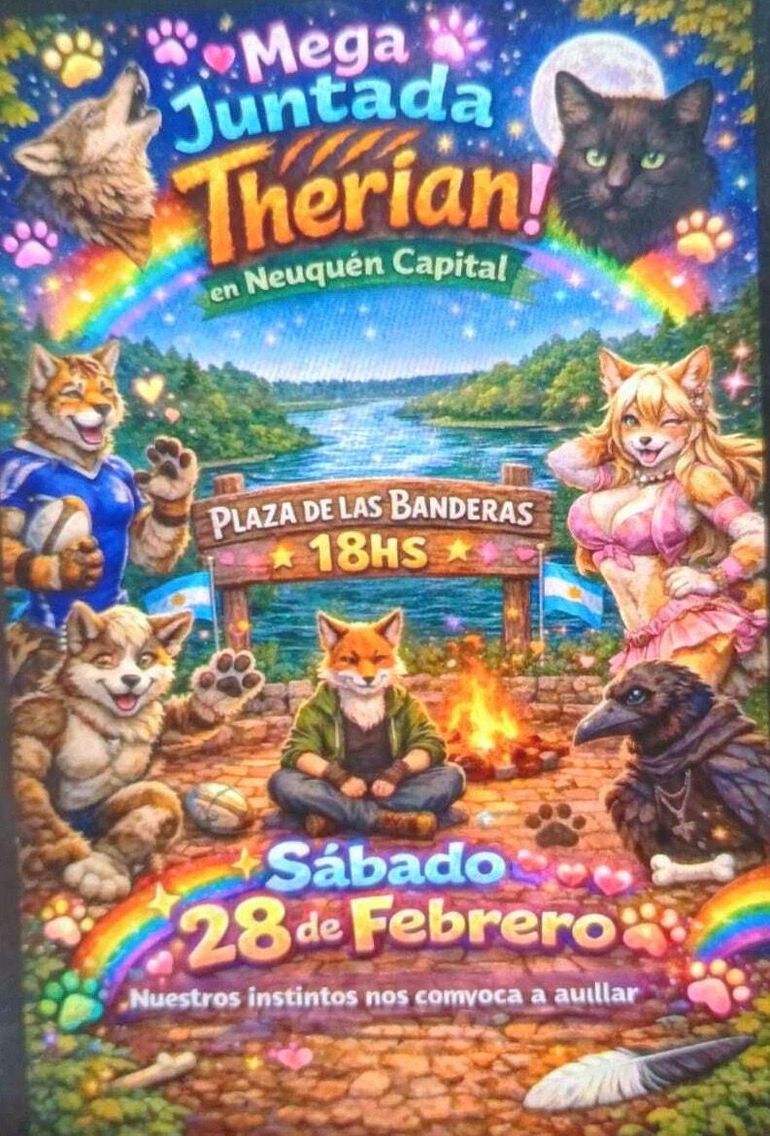Las placas difundidas muestran fechas y horarios concretos. En Neuquén capital la “Mega Juntada Therian” en Plaza de las Banderas, fue anunciada para el sábado 28 de febrero a las 18. ¿Será verdad o es un mito urbano de redes o bromas?