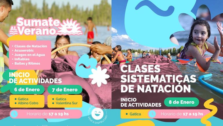 El programa incluye natación, acuaerobic, juegos en el agua, inflables para los más chicos, bailes y ritmos. Todas las actividades son gratuitas y no requieren inscripción previa. Comenzarán el 6 de enero en los balnearios Sandra Canale (Gatica) y Albino Cotro, mientras que el 7 de enero iniciarán en Sandra Canale y Brun de Duclot (Valentina Sur). "La idea es seguir todos los fines de semana de enero, entre las 17 y las 19, para que la gente que está en el río pase un buen momento con actividades", aclaró el funcionario.