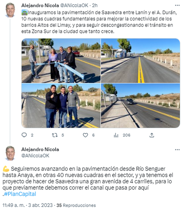 Nicola indicó que los trabajos continuarán: “El tramo de pavimentación que sigue, desde el arroyo Durán hasta Senguer y Senguer, desde Saavedra hasta Anaya, está en proyecto. Ya lo tenemos listo, hubo mucho trabajo para la cuestión pluvial con bombeo porque todo ese sector está en una depresión”.