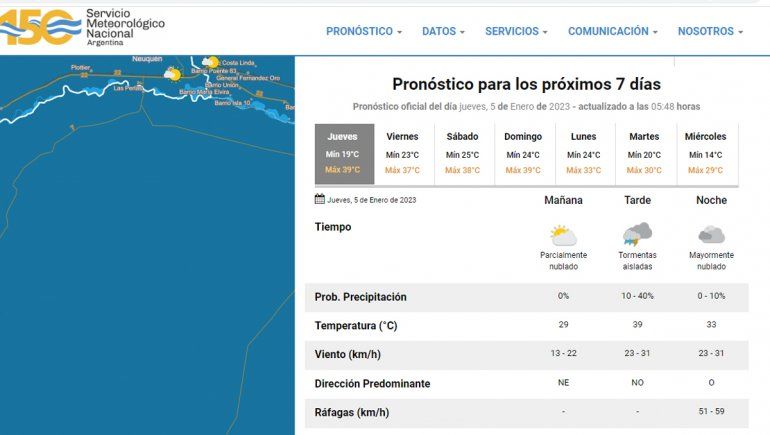 Según la Autoridad de las Cuencas de los Ríos Limay, Neuquén y Negro (AIC), para este jueves se prevé el ingreso de aire subtropical –viento norte- que intensifica la ola de calor y se mantiene durante el fin de semana y hasta el lunes 9 de enero. Habrá Períodos inestables con formación de tormentas eléctricas, algunas secas durante los próximos días y el fin de semana.