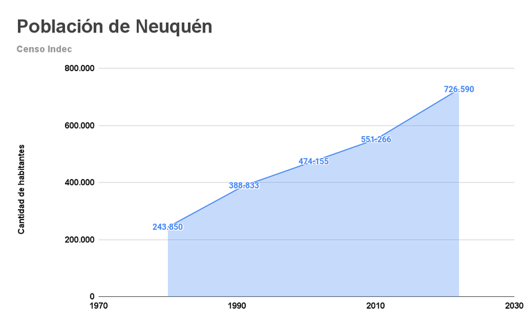 La población neuquina creció en los últimos 40 años a un ritmo mucho mayor que la del país y la del mundo, inclusive. Se multiplicó por tres en cuarenta años, es decir, tuvo un crecimiento del 200 por ciento desde el '80 del siglo pasado, lo que implica un incremento anual en la cantidad de habitantes del cinco por ciento en promedio.