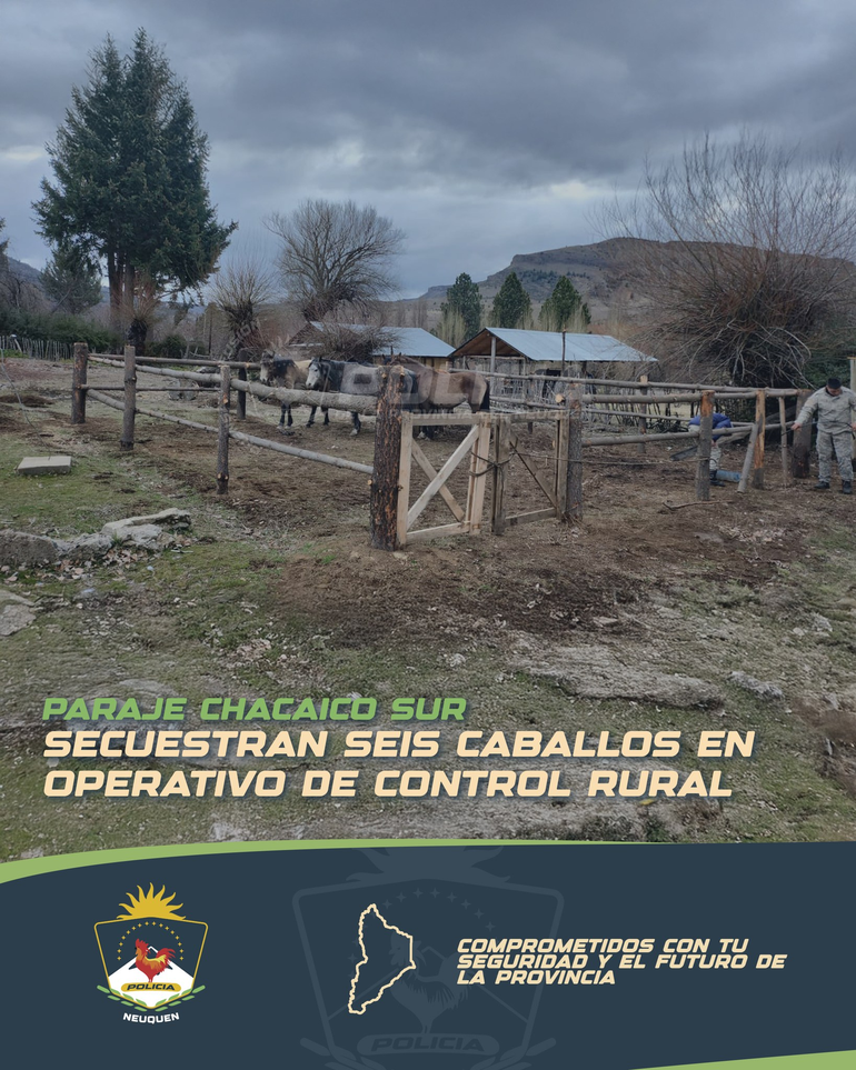 La Policía de Neuquén secuestró este domingo seis caballos vivos de un camión en un camino vecinal del paraje rural Chacaico Sur, ubicado a kilómetros de la localidad neuquina de Las Coloradas. Los animales no tenían sus papeles en regla y quienes los transportaban no contaban con los permisos para moverlos.