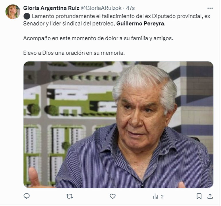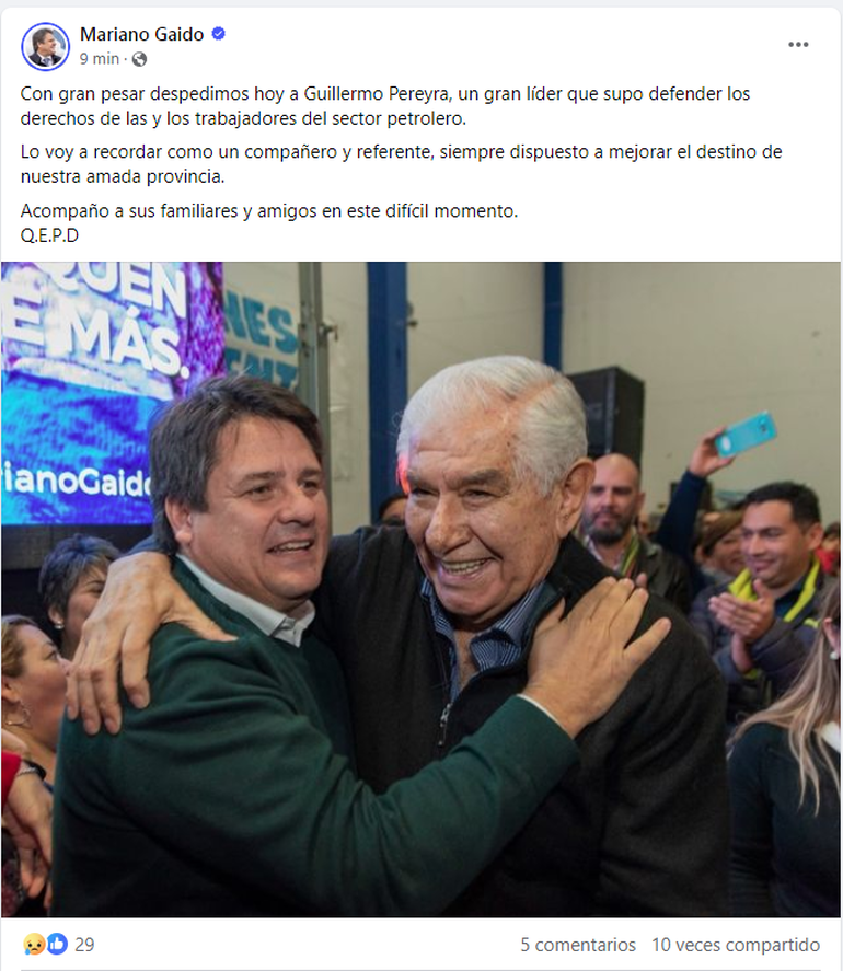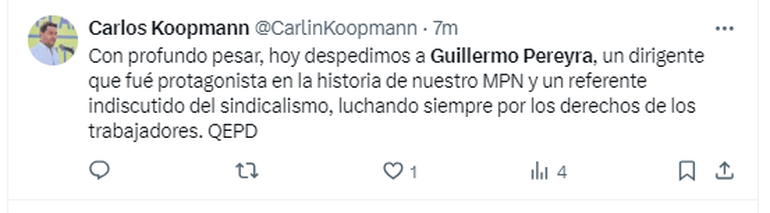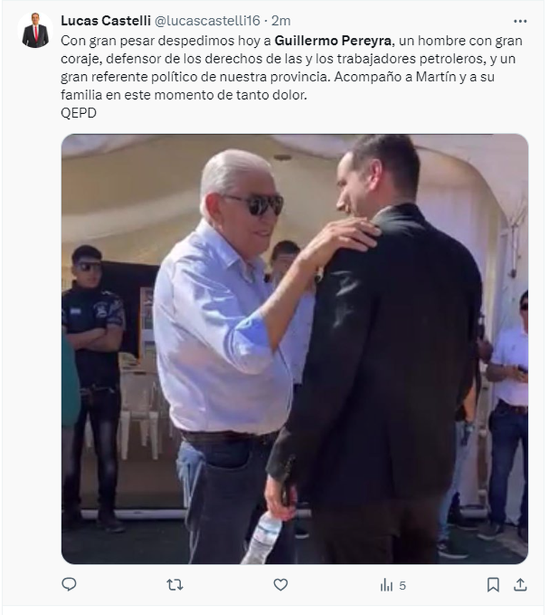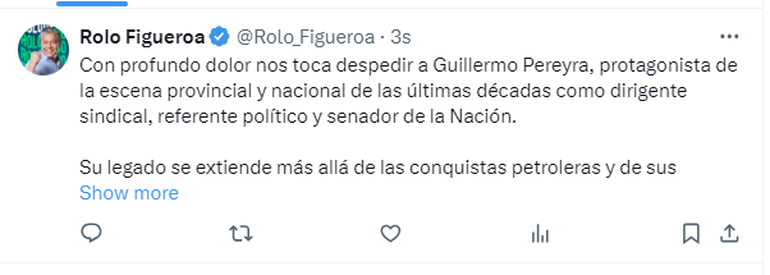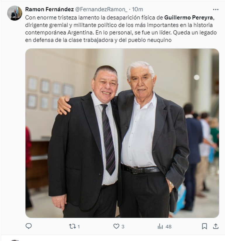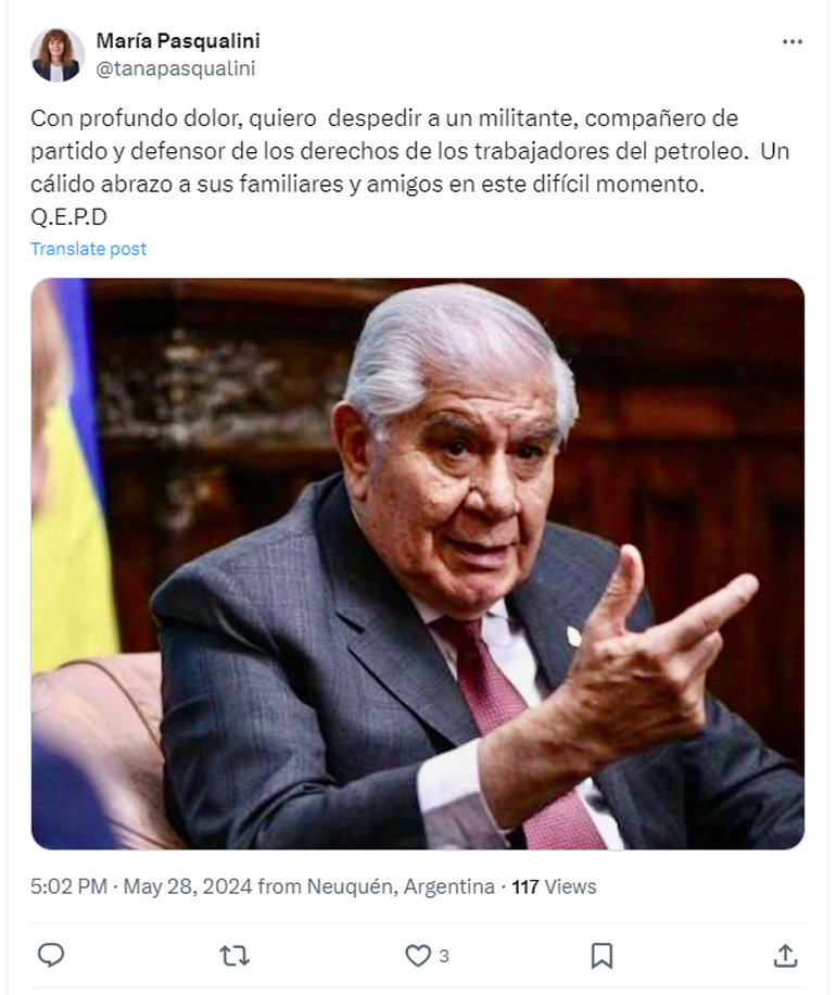 Luego de conocerse la triste noticia, personalidades de la política, así como también familiares y conocidos, se volcaron a las redes para despedirlo y destacar su importante contribución en cuanto a los derechos laborales de las personas que trabajan en el rubro petrolero. Además, destacaron la importancia de su paso por el Senado de la Nación.