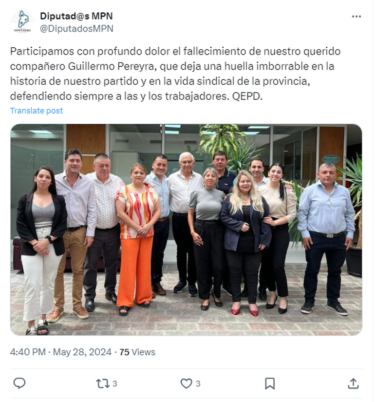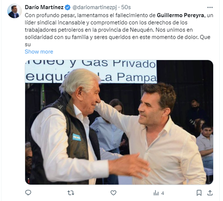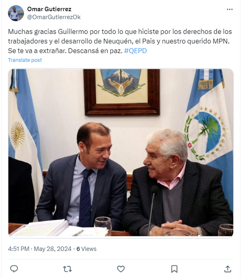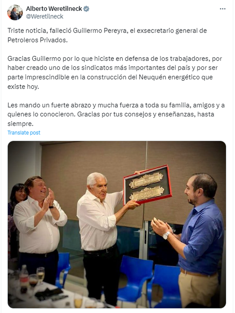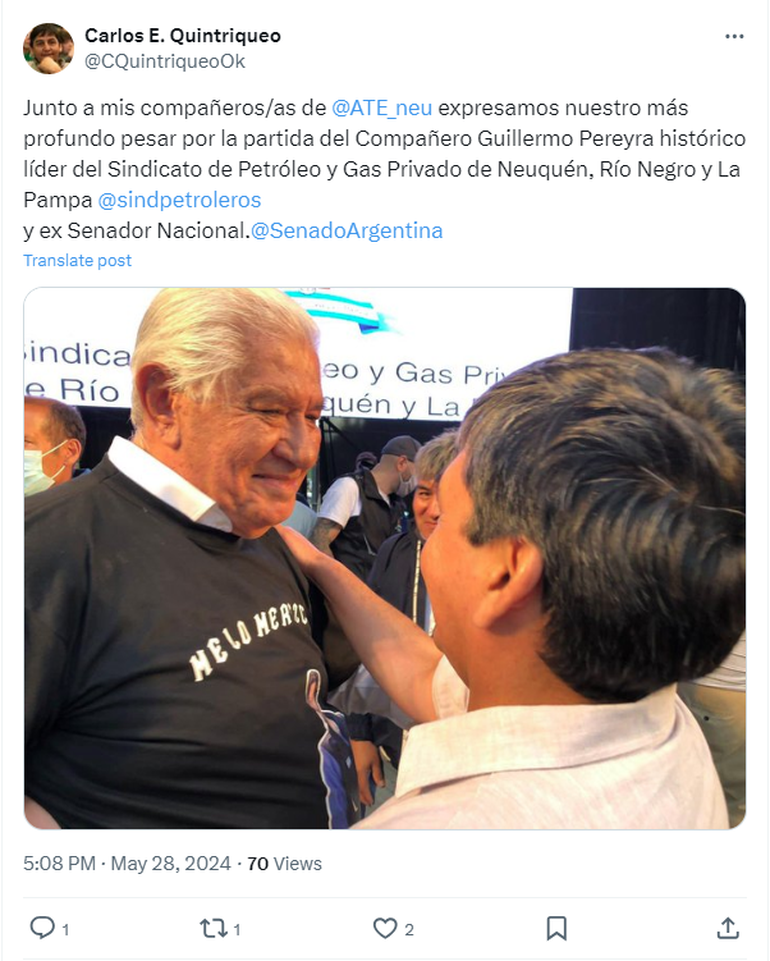 Luego de conocerse la triste noticia, personalidades de la política, así como también familiares y conocidos, se volcaron a las redes para despedirlo y destacar su importante contribución en cuanto a los derechos laborales de las personas que trabajan en el rubro petrolero. Además, destacaron la importancia de su paso por el Senado de la Nación.