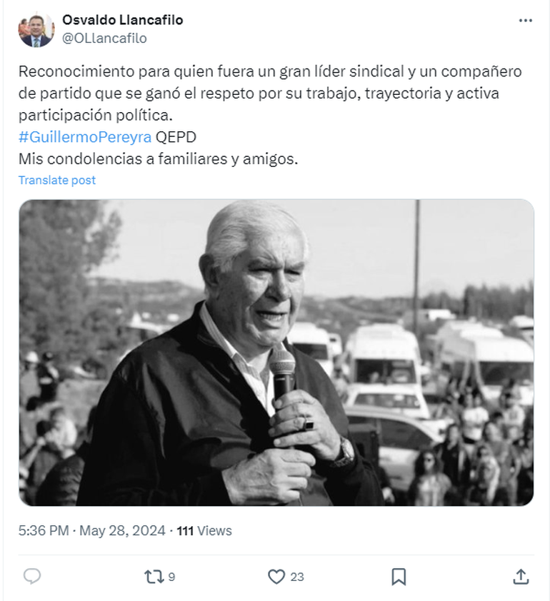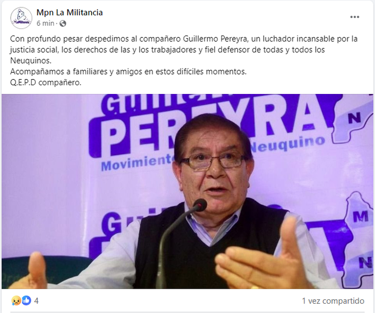 Este martes, minutos antes de las 17, murió Guillermo Pereyra, histórico dirigente sindical de los trabajadores petroleros de la Patagonia y exsenador nacional por la provincia de Neuquén. Tenía 80 años y había sufrido un Accidente Cerebrovascular (ACV).
