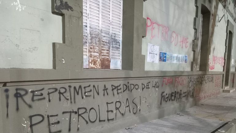 Con aerosol y pegatinas mancharon las paredes del edificio gubernamental. Pidieron la renuncia de funcionarios, y repudiaron el desalojo del acampe que venían desarrollando hasta el domingo en demanda de la obtención de personería jurídica de cuatro comunidades.