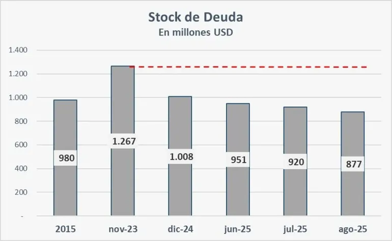 En un año y nueve meses, el Ejecutivo neuquino logró bajar el stock de deuda un 31 por ciento, lo que implica 390 millones de dólares. Así surge de la comparativa de datos registrados en agosto de 2025, donde el stock de deuda pública asciende a 877 millones de dólares, frente a 1.267 millones de dólares, que tenía en noviembre de 2023.