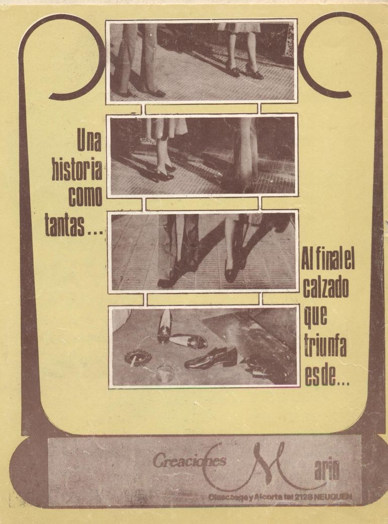 La publicidad de “Creaciones Mario” es rescatada de una publicación informativa de pequeña tirada del año 1978, en la que a través de una serie de fotos se cuenta una historia. La primera de las fotografías muestra en plano detalle los rutilantes calzados de una pareja que parece haberse encontrado en la calle del modo más casual, en la segunda y tercera fotografía el mismo plano detalle sugiere que emprenden una caminata hacia algún sitio, la última de las fotos muestra los dos pares de zapatos, a quienes sus dueños abandonaron con prisa y desfachatez, junto a una copa de whisky y un cigarrillo consumiéndose a solas en un cenicero, siendo el indicio de que se ha concretado el amor y tal vez sellado el destino de una nueva pareja.