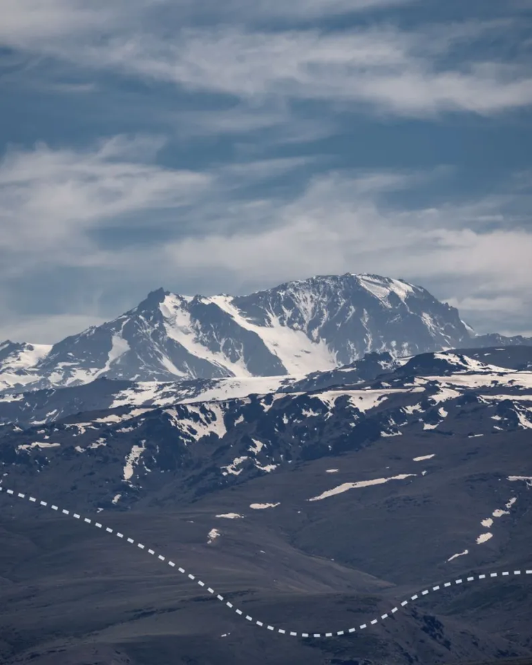 Desde cada punto, la vista se despliega en capas: el Cajón del Río Neuquén serpenteando en el fondo del valle, la Cordillera del Viento extendiéndose hacia el horizonte, las cumbres nevadas de los Andes y, dominándolo todo, el Volcán Domuyo, el más alto de la Patagonia, elevándose a 4.709 metros sobre el nivel del mar.