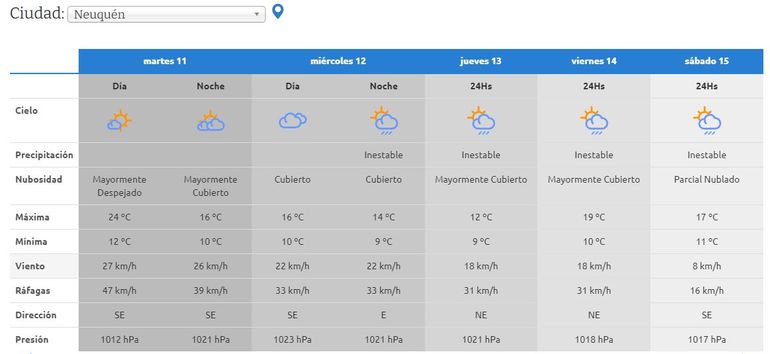 El primer día hábil tendrá cielo mayormente nublado, con una amplitud térmica limitada con una máxima que no superará los 17 grados y una mínima de 10°C. De acuerdo al pronóstico de la AIC podrían generarse tormentas durante toda la jornada con posible caida de agua en Neuquén y alrededores.